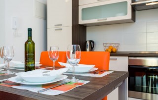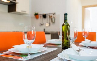 Kuhinja i blagovaonica: štednjak sa četri ploče, hladnjak sa ledenicom, pećnica, kuhala za kavu i vodu, pribor za pripremanje i posluživanje hrane.